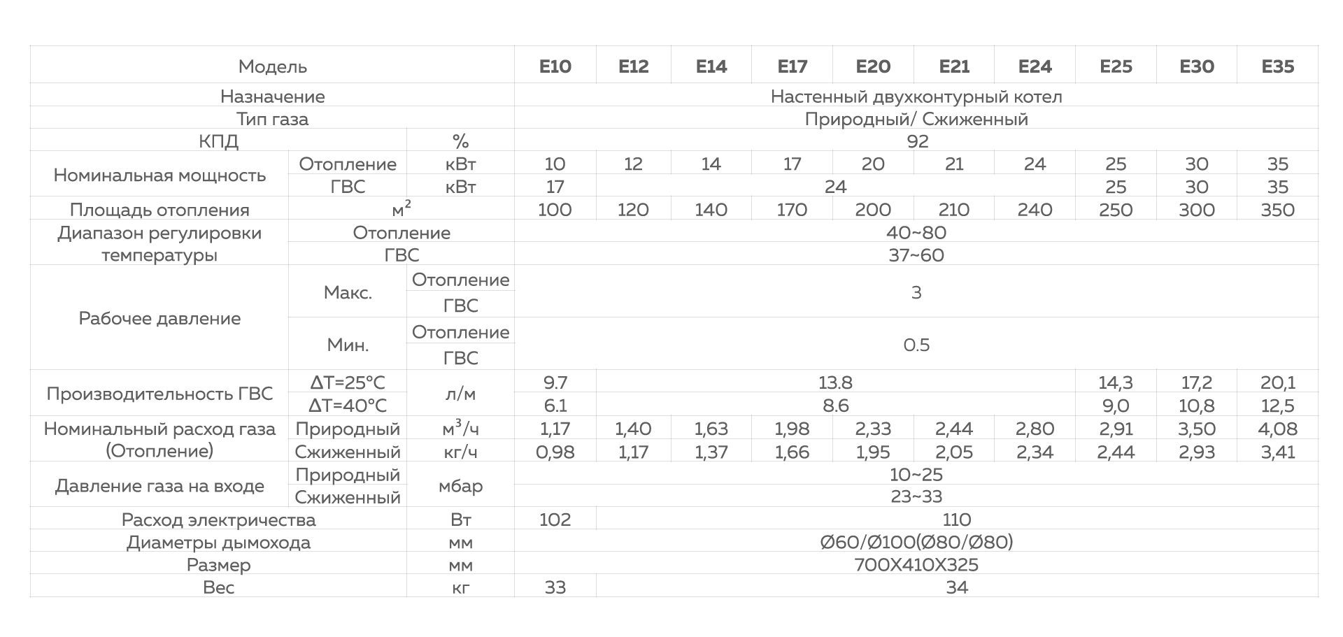 Одним из наиболее востребованных является котел Daesung E24 на 24 кВт. Он позволяет отапливать дома площадью до 240 м². Самым мощным в серии является котел на 35 кВт для домов площадью до 350 м². Главные особенности и достоинства этой и других представленных моделей: